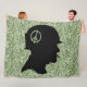Snuggly blanket features camo background with Vietnam era soldier silhouette graphic that includes peace sign on helmet.
