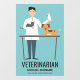 Design for veterinarians and veterinary clinics featuring Destei's cartoon illustration of a veterinarian man with some animals. The man is wearing a white laboratory coat while holding a grey cat and a cockatiel type parrot bird. There is also a cute little brown dog lying on a table. The background colour is blue. Personalise the sample text areas with your custom text.