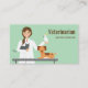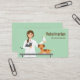 Destei's cartoon illustration of a happy female veterinarian. The woman is holding a grey cat. There is also a white cockatiel type parrot bird on her other hand. In front of the veterinarian there is a grey table that has a cute little brown dog lying on it. The veterinarian woman is wearing a white laboratory coat. She has long brown hair that is placed in a low ponytail draping over one of her shoulders. The background colour is light green.