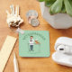 Cute design for veterinarians featuring Destei's cartoon illustration of a female veterinarian with some animals. The woman is wearing a white laboratory coat while holding a grey cat and a cockatiel type parrot bird. There is also a cute little brown dog lying on a table. The background colour is light green. On the top it reads "Veterinarian" and on the bottom there is a personalizable text area for a name.