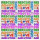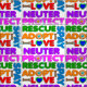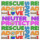 Colourful animal rescue wording, "spay, neuter, adopt, protect, rescue and love", with paws and dog bone graphics.