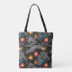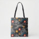 Immerse yourself in a dynamic fusion of colour and form with this abstract floral tote bag. Featuring stylised flowers in vivid red, orange, and yellow hues, complemented by flowing wavy lines and scattered blue and white dots, all set against a deep black background, this tote bag exudes a bold and energetic aesthetic. The interplay of vibrant elements creates a striking contrast, making it an ideal choice for those seeking a unique and artistic touch. This tote bag appeals to lovers of modern botanical art and abstract expression.