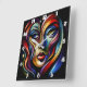 A striking abstract portrait features flowing lines and vivid colours, showcasing a stylised face with expressive features and an artistic flair.