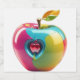 This image showcases a vividly coloured, digitally rendered apple that combines an array of bright, contrasting hues. The apple features a glossy finish with a smooth, reflective surface. In the centre of the apple is a carved heart-shaped cutout containing a smaller apple symbol, emphasizing a playful, layered design. The apple's stem is topped with an artistic combination of an orange and green leaf, adding an extra splash of colour and creativity.
