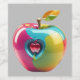 This image showcases a vividly coloured, digitally rendered apple that combines an array of bright, contrasting hues. The apple features a glossy finish with a smooth, reflective surface. In the centre of the apple is a carved heart-shaped cutout containing a smaller apple symbol, emphasizing a playful, layered design. The apple's stem is topped with an artistic combination of an orange and green leaf, adding an extra splash of colour and creativity.