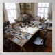 This wider shot offers an overview of a bustling art studio, showcasing its "organised disorder." Canvases lean against walls, sculptures stand at various stages of completion, and art supplies are spread across multiple surfaces. The scene conveys a sense of vibrant, ongoing artistic energy and a rich environment where inspiration flourishes.