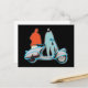 Indulge in a journey back to the captivating allure of the 1960s with our stunning postcard featuring a vibrant retro design. Against a sleek black backdrop, two abstract figures steal the spotlight - one adorned in striking orange hues, the other in calming light blue tones. Positioned before them is a sleek grey motor scooter, outlined in vibrant blue, evoking the essence of Italian style and motosport chic.