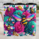 This delightful design showcases several bumblebees with shimmering, rainbow-hued wings, buzzing amidst a vibrant explosion of fuchsia, pink, and teal roses. Golden honeycomb structures and tiny hearts are scattered throughout, adding whimsical charm. The detailed artistry creates a lively, colourful, and enchanting floral scene, perfect for a decorative tumbler.