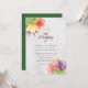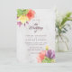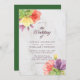 This elegant floral wedding invitation features vibrant blooms with the words "the wedding of" in trendy script all against a pale marble background on the front and a green colour back side.