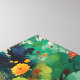 This energetic design features a central cluster of bright orange calendula flowers surrounded by an explosion of lush green foliage and abstract watercolor splashes in shades of teal, blue, and hints of red and purple. This vibrant and artistic design brings a touch of natural energy to any product.