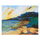A striking coastal scene with intense colors features a vivid sky and textured landscape. The composition blends bright and dark tones artfully.