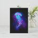 Large, blue, artistically drawn, glowing, bright jellyfish, with long tentacles on black background with purple bioluminescence. Luminous jellyfish.