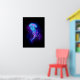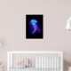 Large, blue, artistically drawn, glowing, bright jellyfish, with long tentacles on black background with purple bioluminescence. Luminous jellyfish.