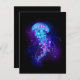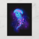 Large, blue, artistically drawn, glowing, bright jellyfish, with long tentacles on black background with purple bioluminescence. Luminous jellyfish.