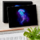 Large, blue, artistically drawn, glowing, bright jellyfish, with long tentacles on black background with purple bioluminescence. Luminous jellyfish.