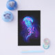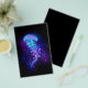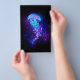 Large, blue, artistically drawn, glowing, bright jellyfish, with long tentacles on black background with purple bioluminescence. Luminous jellyfish.