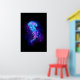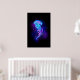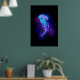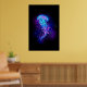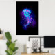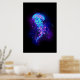 Large, blue, artistically drawn, glowing, bright jellyfish, with long tentacles on black background with purple bioluminescence. Luminous jellyfish.