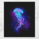 Large, blue, artistically drawn, glowing, bright jellyfish, with long tentacles on black background with purple bioluminescence. Luminous jellyfish.