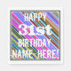 This fun birthday-themed paper napkin design features a message like "HAPPY 31st BIRTHDAY, NAME-HERE!", where the name can be customised. The background features a vibrant, multicolored stripes pattern. The message text is coloured white, and has a distressed appearance. Napkins like these could perhaps be used at a birthday party for somebody who is celebrating their thirty first birthday. [~Z0000270]