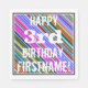 This fun birthday-themed paper napkin design features a message like "HAPPY 3rd BIRTHDAY, FIRSTNAME!". The background features a vibrant, multicolored stripes pattern. The message text is coloured white, and has a distressed appearance. Napkins like these could perhaps be used at a birthday party for somebody who is celebrating their third birthday. [~Z0000270]