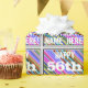This fun birthday-themed wrapping paper design features a message like "HAPPY 56th BIRTHDAY, NAME-HERE!", where the name can be customised. The background features a vibrant, multicolored stripes pattern. The message text is coloured white, and has a distressed appearance. Wrapping paper like this could perhaps be used when wrapping gifts or presents being given to somebody who is celebrating their fifty sixth birthday. [~Z0000272]