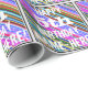 This fun birthday-themed wrapping paper design features a message like "HAPPY 5th BIRTHDAY, NAME-HERE!", where the name can be customised. The background features a vibrant, multicolored stripes pattern. The message text is coloured white, and has a distressed appearance. Wrapping paper like this could perhaps be used when wrapping gifts or presents being given to somebody who is celebrating their fifth birthday. [~Z0000272]