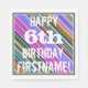 This fun birthday-themed paper napkin design features a message like "HAPPY 6th BIRTHDAY, FIRSTNAME!", where the name can be personalised. The background features a vibrant, multicolored stripes pattern. The message text is coloured white, and has a distressed appearance. Napkins like these could perhaps be used at a birthday party for somebody who is celebrating their sixth birthday. [~Z0000270]