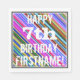 This fun birthday-themed paper napkin design features a message like "HAPPY 7th BIRTHDAY, FIRSTNAME!", where the name can be customised. The background features a vibrant, multicolored stripes pattern. The message text is coloured white, and has a distressed appearance. Napkins like these could perhaps be used at a birthday party for somebody who is celebrating their seventh birthday. [~Z0000270]