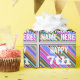 This fun birthday-themed wrapping paper design features a message like "HAPPY 7th BIRTHDAY, NAME-HERE!", where the name can be customised. The background features a vibrant, multicolored stripes pattern. The message text is coloured white, and has a distressed appearance. Wrapping paper like this could perhaps be used when wrapping gifts or presents being given to somebody who is celebrating their seventh birthday. [~Z0000272]