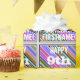 This fun birthday-themed wrapping paper design features a message like "HAPPY 9th BIRTHDAY, FIRSTNAME!", where the name can be customised. The background features a vibrant, multicolored stripes pattern. The message text is coloured white, and has a distressed appearance. Wrapping paper like this could perhaps be used when wrapping gifts or presents being given to somebody who is celebrating their ninth birthday. [~Z0000272]
