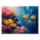 A mesmerising underwater scene featuring a vibrant coral reef teeming with life. Colourful tropical fish swim gracefully among the bright yellow, pink, and red corals, while sunlight filters through the crystal-clear blue water, creating a dazzling display of light and movement.
