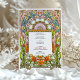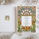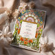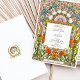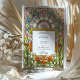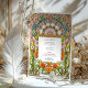 This stunning Art Nouveau wedding invitation showcases a colourful floral arch filled with vibrant orange blossoms, delicate white daisies, soft pink cosmos, and light blue forget-me-nots. Ornate botanical details and golden accents frame the text area, creating a harmonious blend of nature-inspired elegance and vintage charm. The symmetrical layout and intricate linework make this design perfect for couples seeking a romantic and timeless wedding stationery with a touch of artistic sophistication.