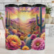 This breathtaking illustration captures a desert landscape bathed in the warm glow of a setting sun. Saguaro cacti stand tall amongst a field bursting with colourful blooming desert flowers. Distant mountains fade into the radiant horizon, and birds fly across the painted sky, creating a vibrant and serene scene.