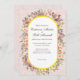 Invite your loved ones to a celebration filled with joy and colour using our Vibrant Floral Arch Wedding Invitation. This stunning design features a lush and lively border of assorted bright blooms and greenery, creating an eye-catching botanical frame. Your personalised wedding details are elegantly showcased within a chic gold-toned oval, all set against a soft, subtly textured pink background. The vivid watercolor flowers bring a cheerful and romantic touch, perfect for garden parties, summer weddings, or any festive occasion that calls for a pop of vibrant elegance. Easily customise all text to reflect your unique wedding story.