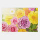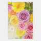 A vivid, high-key floral design featuring lush roses, dahlias, a daisy, and a sunflower arranged in a striking horizontal composition. Bright backlighting on the left blends into a deep, rich background on the right, making the pink, yellow, and purple blooms glow with color. Perfect for yoga mats, sport towels, fitness gear, scarves, and décor lovers who want bold, joyful floral energy.