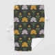A striking pattern featuring yellow and purple flowers with green stems and leaves on a black background.
