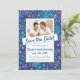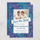 This save-the-date announcement comes complete with a beautifully hand painted watercolor border in teal and purple, embellished with hand-drawn white flowers. This invite is fully customisable, and gives you the option to display your favourite photo of you as a couple. This version features the words "Save the Date" with the other information below.