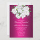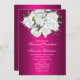 This Vibrant Fuchsia Pink Boho Roses Wedding invitation features a stunning, colourful metallic pink base with a gorgeous bridal bouquet full of beautiful white roses hanging down from the top. There are more roses on the back of the card. This charming invitation would be most suitable for a garden wedding or any outdoor event which requires strong floral accents.