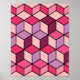 This design showcases a striking, tessellating pattern of cubes in various shades of pink, purple, and red. The use of repeating hexagonal shapes creates a 3D illusion, with each cube carefully outlined in black to enhance the depth and dimension. The lively colour palette and geometric symmetry give this piece a modern, playful energy, perfect for backgrounds, wallpapers, or decorative art pieces.
