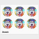 These round stickers feature a vibrant art painting of a smiling golden retriever dog, who is wearing a hat and black nerd glasses.