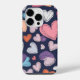 Brighten up your phone with this eye-catching iPhone case featuring a playful and romantic pattern of colourful hearts. The vibrant design showcases hearts in various shades of pink, blue, purple, and orange, scattered across a stylish dark blue background. Some hearts have outlined edges for added dimension, while others are filled in for a bold look.