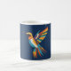 A colourful hummingbird hovers in mid-air, its wings a blur.