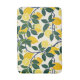 The pattern features a lively and vibrant design with lush lemon trees. The branches are adorned with ripe, bright yellow lemons, some of which are sliced open to reveal their juicy interiors. The lemons are surrounded by deep green leaves, which contrast beautifully with the warm, cream-coloured background. The overall style is bold and stylised, with clean lines and a sense of symmetry, creating a fresh and cheerful aesthetic that evokes a Mediterranean vibe.