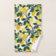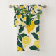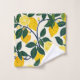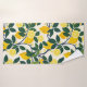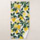 The pattern features a lively and vibrant design with lush lemon trees. The branches are adorned with ripe, bright yellow lemons, some of which are sliced open to reveal their juicy interiors. The lemons are surrounded by deep green leaves, which contrast beautifully with the warm, cream-coloured background. The overall style is bold and stylised, with clean lines and a sense of symmetry, creating a fresh and cheerful aesthetic that evokes a Mediterranean vibe.