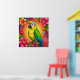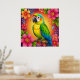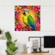 Colourful parrot with vivid plumage sits on a branch, accompanied by bright tropical flowers against a serene blue background, creating a vibrant and lively tropical theme.