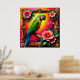 Colourful parrot with vivid plumage sits on a branch, accompanied by bright tropical flowers against a serene blue background, creating a vibrant and lively tropical theme.