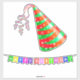 A cheerful party hat featuring bright red and green colours adorned with stars and ribbons, perfect for festive celebrations.