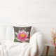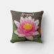 Add your name to this stunning throw pillow. The beautiful burst of yellow in the flower's centre is surrounded by the vibrant pink flower petals of this water lily on this throw pillow. This photo captures the entire flower surrounded by dark green lily pads. The back of the pillow features a solid dark green colour which can be customised if you desire.