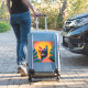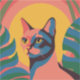 This is a vibrant pop art style digital illustration of a cat's portrait. The cat is depicted with bold, flat areas of color in shades of pink, blue, and black, creating a striking and modern aesthetic. Its eyes are yellow, and it has a focused gaze. The cat is set against a background with a large yellow circle, possibly representing the sun or a stylized design element, and abstract shapes of green and blue, suggesting foliage or a stylized environment. The overall style is reminiscent of pop art, with its use of strong colors and simplified forms. The artwork captures the essence of the cat in a contemporary and eye-catching manner.