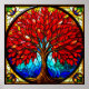Vibrant stained glass artwork illustrating a radiant red tree adorned with intricate details. Vibrant colours and detailed craftsmanship evoke warmth and serenity. Ideal for art enthusiasts or decorative themed designs.